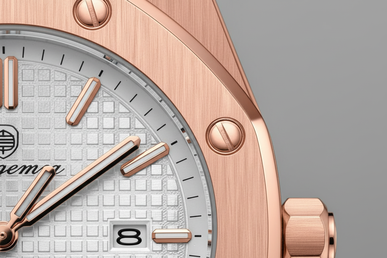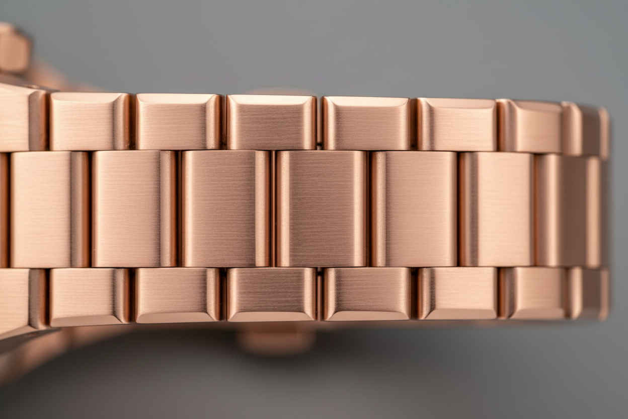 • Gehäuse aus gebürstetem Edelstahl mit roségoldener PVD-Beschichtung